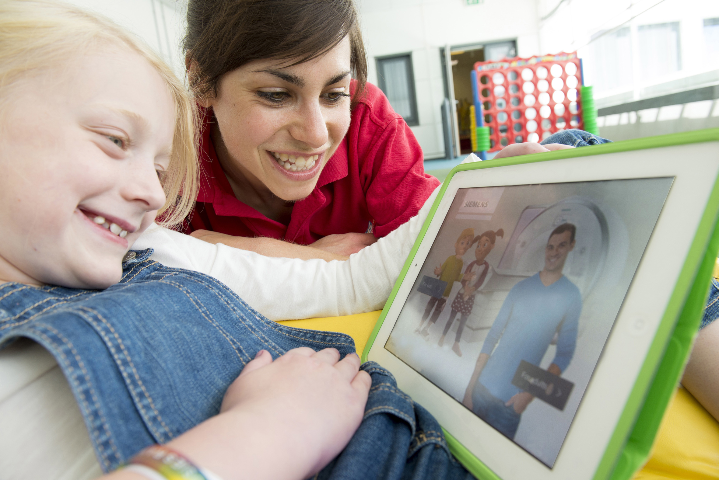 Sarah Browne, Play Specialist at John Radcliffe Children’s Hospital is using the MRI Scan App from Siemens Healthcare during MRI play preparation with her young patients.