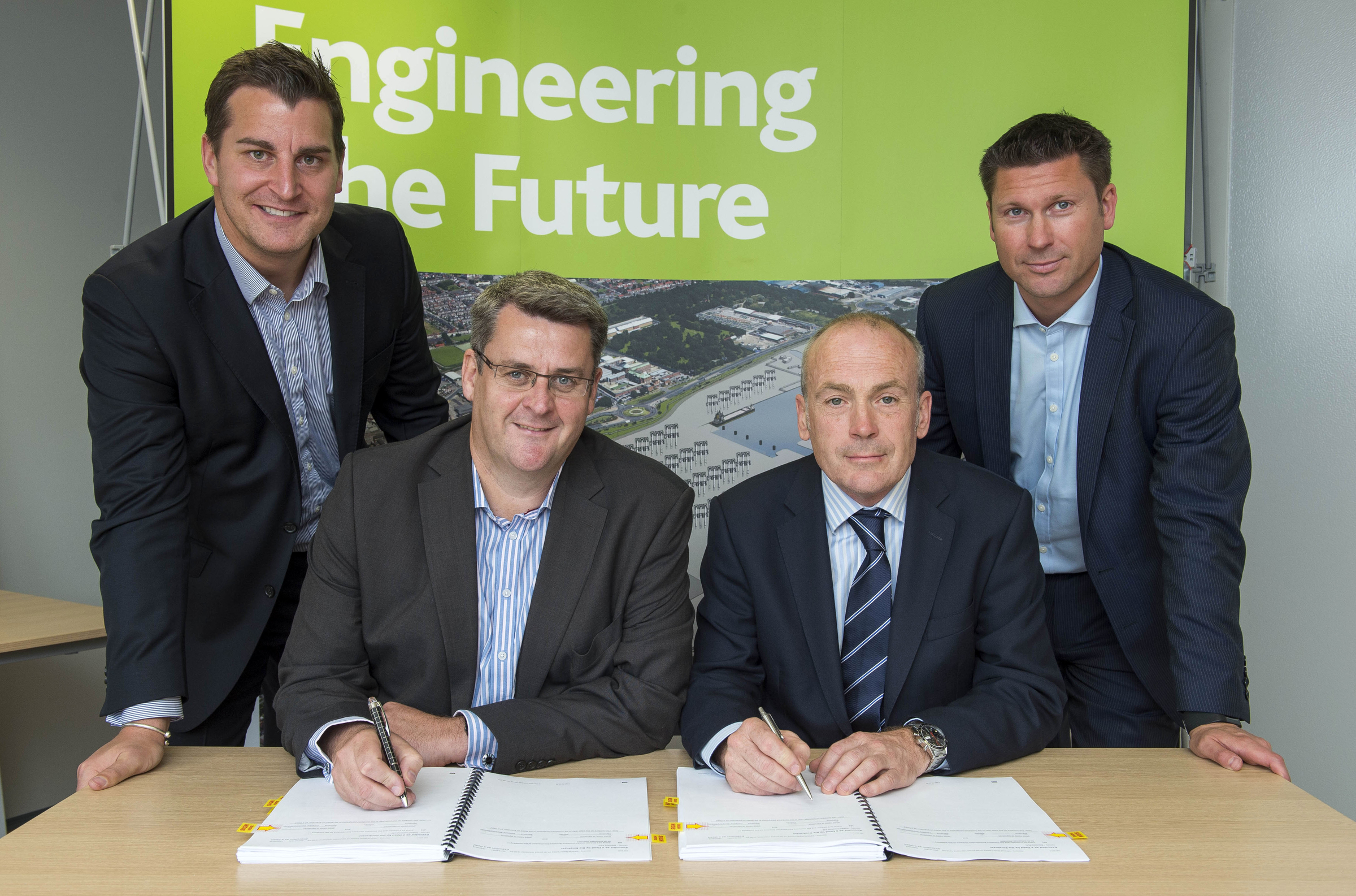 Finbarr Dowling, Siemens Hull Project Director, left, and Richard Offord, VolkerFitzpatrick Managing Director, sign the blade factory construction contract with Ross Dean, Siemens Hull Project Commercial Director, top left, and Jonathon Suckling, VolkerFitzpatrick Commercial Director.