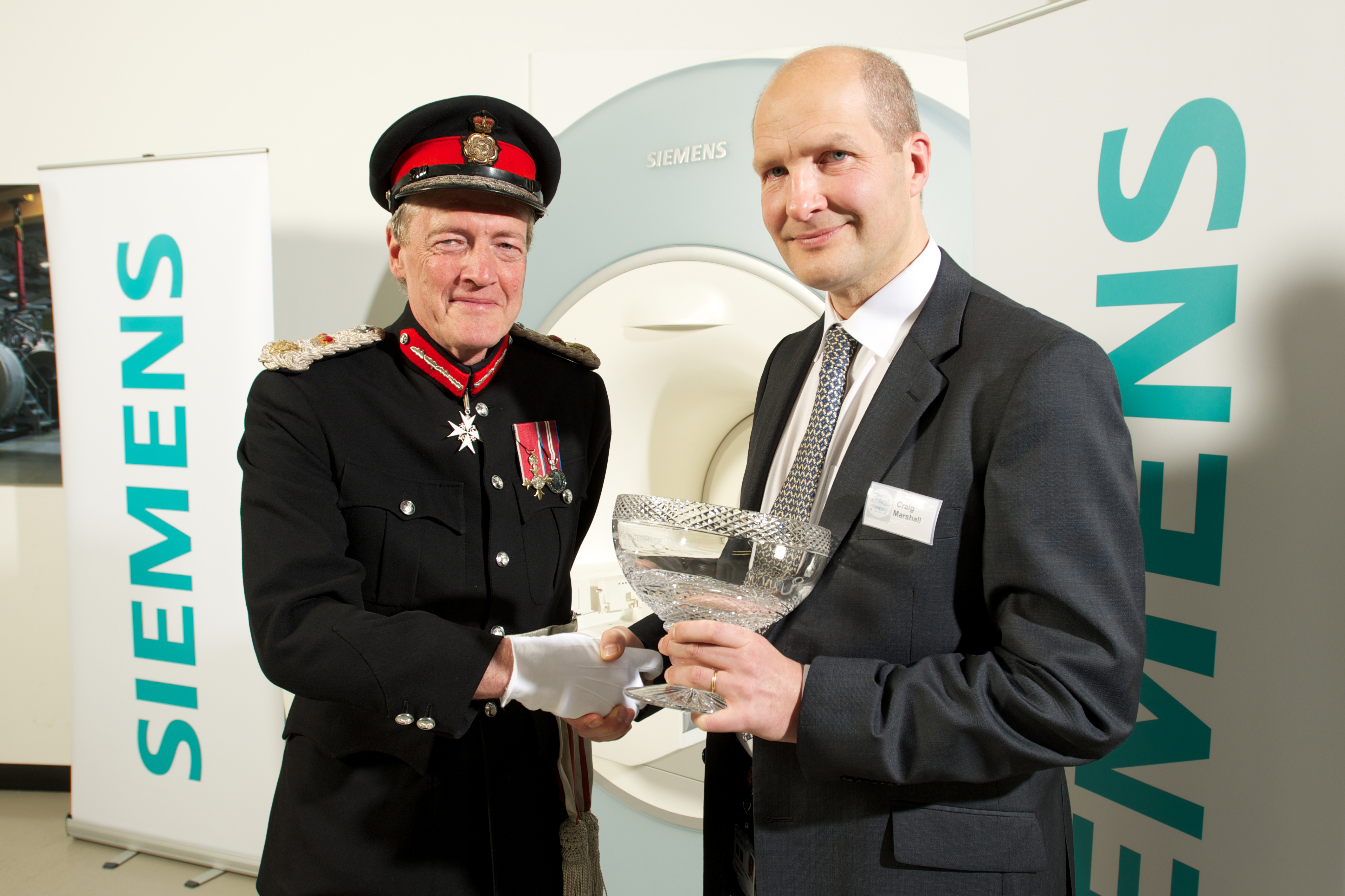 The Lord Lieutenant of Oxfordshire, Mr Tim Stevenson presenting the award to Craig Marshall, Managing Director at Siemens Magnet Technology.