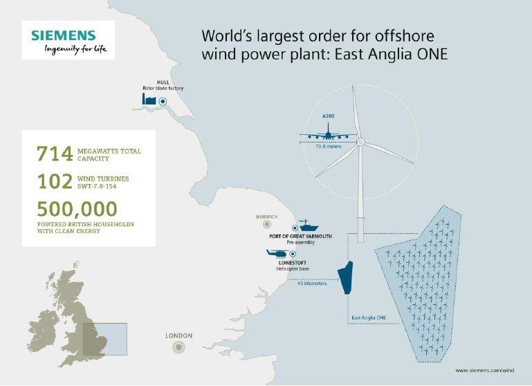 "Siemens is delighted to work with ScottishPower Renewables on the East Anglia ONE offshore wind power plant," stated Michael Hannibal, CEO Offshore of the Siemens Wind Power and Renewables Division. "This represents the largest single order ever for our direct-drive, 7-megawatt wind turbine. The decision to go with our innovative wind turbines underscores the contribution made by these units to reducing the costs of offshore wind power."